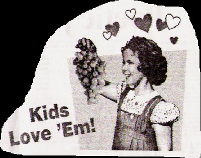 This is a picture of a Shirley Temple. She is highly infatuated with a cluster of allegedly green or red seedless grapes.
