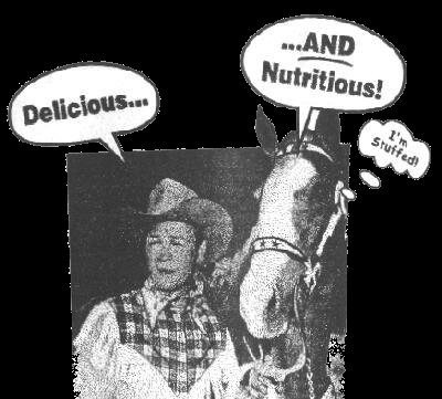 Roy Rogers died this week; Treasure Island pays homage to America's greatest cowboy by letting him posthumously hawk broccoli. Trigger (also dead) states ironically, that he is stuffed. Which of course, he is, and standing in the Roy Rogers museum.